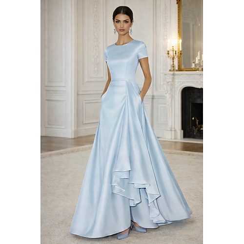 Linea ad A Asimmetrico Lunghezza al pavimento Abito da Sera Da principessa Abito formale Elegante Setoso Manica Corta Girocollo Matrimonio Formale Tasca Raso Shiena scoperta con Fiore ricamato Pieghe