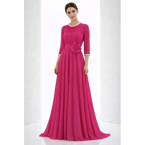 Linea ad A Lunghezza al pavimento Abito da Sera Elegante Brillanti Manica 3/4 Girocollo Matrimonio Formale Chiffon con Arricciato Perle