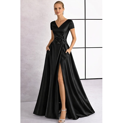 Linea ad A Lunghezza al pavimento Abito da Sera Elegante Abito Nero Spacco Alto Manica Corta Scollo a V Matrimonio Formale Tasca Raso Shiena scoperta con Fiore ricamato Arricciato