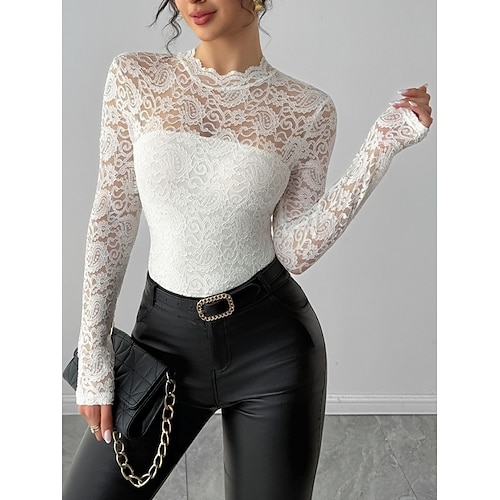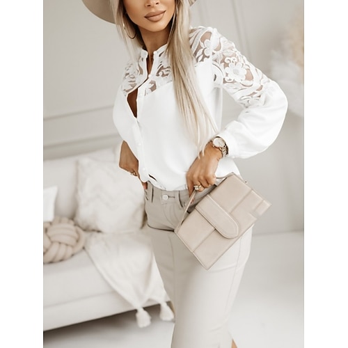 Per donna Blusa Pizzo Patchwork Tinta unica Elegante Essenziale Casual Manica Lunga Collo Alto Top Regolari Quotidiano Bianco Estate Primavera Autunno