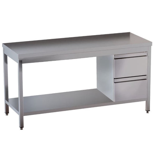 VM Europa Edelstahl Arbeitstisch mit Grundboden, 2 Schubladen rechts, Premium - montiert: 200 x 60 cm / ohne Aufkantung / fertig montiert
