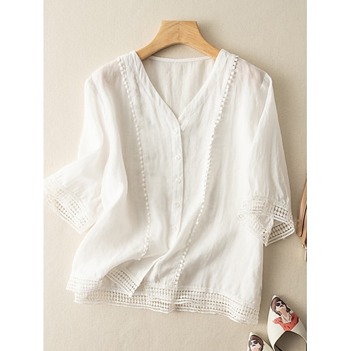Per donna Camicie di cotone e lino Tinta unica Elegante Essenziale Casual Manica 3/4 Scollo a V Top Regolari Quotidiano Bottoni Blu Bianco Rosa Cachi Estate Primavera Autunno