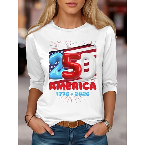T-shirt grafica per il 250° Giorno dell'Indipendenza delle Donne Americane bandiera USA moda stilosa classica maniche lunghe collo rotondo top regolari stampa quotidiana da weekend blu nero bianco