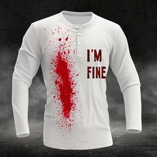 Camicia da uomo Costumi Macchie di Sangue Divertenti Macchie di Sangue IO STO BENE Camicia Henley Maniche Lunghe Moda Carina Quotidiana Casual Vacanza Autunno Primavera e Autunno Bianca Verde Chiaro