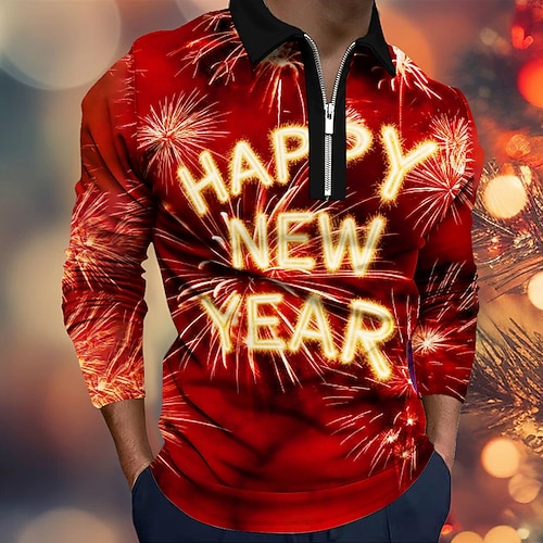 Capodanno Per uomo Fuochi d'artificio Polo Manica Lunga Magliette polo Bavero Casual Abbigliamento quotidiano Abito da festa Stampa 3D Polo con cerniera a un quarto Primavera Autunno Inverno Blu