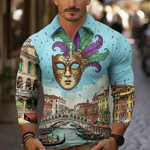 Per uomo Polo Polo con zip Quotidiano Carnevale Bavero Manica Lunga Moda Hawaiano Grafico Maschera Stampa Zip a un quarto Primavera Autunno Vestibilità regolare Giallo Rosso Azzurro Polo