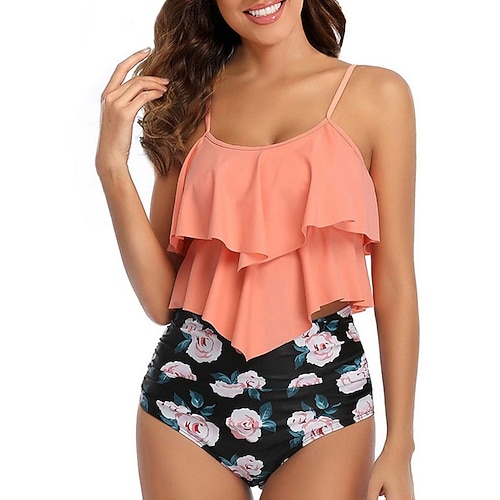Costume da bagno tankini da donna a 2 pezzi con arricciatura e gonna slip schiena scoperta elegante per vacanze color solido colletto a V e senza maniche