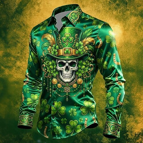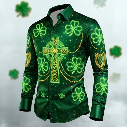 Maglietta da uomo con trifoglio e arte celtica di San Patrizio Camicia in satin Camicia da sera a maniche lunghe Vintage Retro Festa Vacanza Estate Primavera Camicie a bottoni con stampa 3D Nera 1