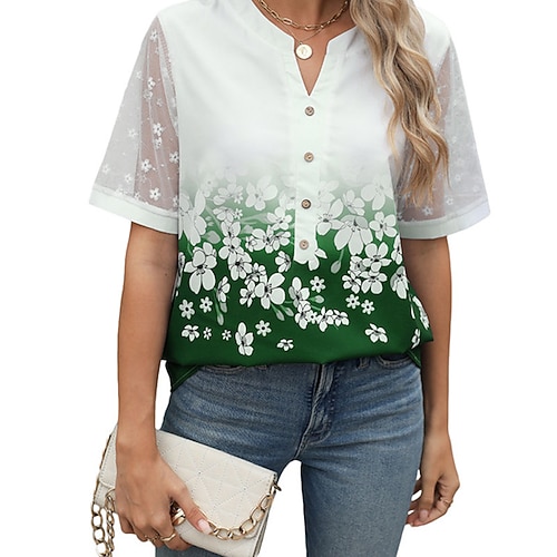 Per donna Top estivi Blusa Top Eleganti Floreale Grafico Semplice Elegante Vintage Quotidiano Manica Corta Scollo a V Top Regolari Quotidiano Lavoro Ferie Arricciato Pizzo Patchwork Blu Verde
