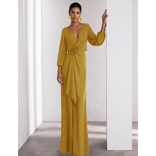 Abito da Sera A-Line Elegante Formale Ospite di Matrimonio Lungo Fino al Pavimento Maniche Lunghe Collo a V Crepe Elasticizzato con Rouches