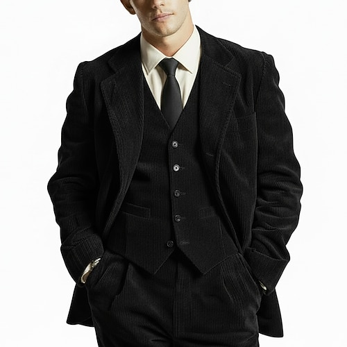 Uomo Affari Casuale Abito in velluto a coste Bavero classico Nero Borgogna Quotidiano Affari A righe Vestibilità su misura 3 pezzi Monopetto Due Bottoni