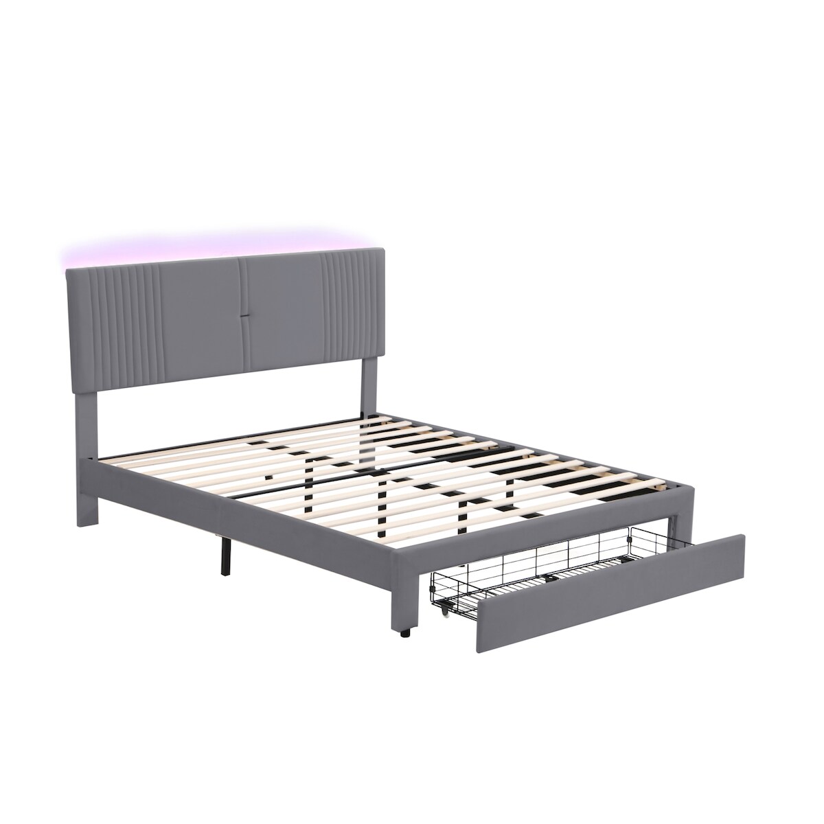 OKWISH Polsterbett 160x200 cm mit LED-Lichtleisten, USB-Anschlüssen und großer Schublade, Samtstoff Grau, modernes Doppelbett mit Stauraum