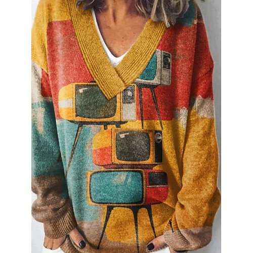 Per donna Felpa Casual Morbido Animale Blocco di colori A Coste Scollo a V Lavorato a maglia Manica Lunga Top Regolari Maglia All'aperto Quotidiano Weekend Giallo Rosso Autunno Inverno