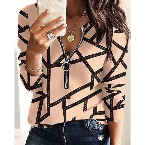 Per donna Maglietta Grafico Geometrico Blocco di colori Vintage Elegante Classico Manica Lunga Scollo a V Top Regolari Quotidiano Weekend Cerniera Stampato Vino Autunno Inverno
