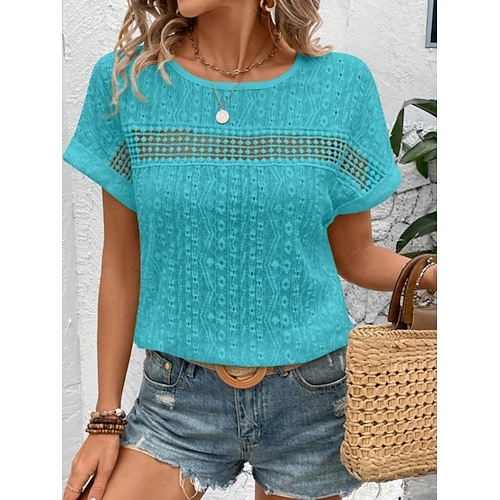Per donna Maglietta Semplice Moda Elegante Classico Manica Corta Girocollo Top Regolari Quotidiano Weekend Traforato Blu Bianco Rosa Verde Beige Estate