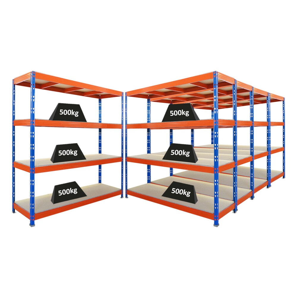 Proregal Mega Deal | 5x Profi Schwerlastregal Rhino | HxBxT 200x200x60cm | 4 Spanplatten-Ebenen 16mm | Fachlast 500kg | Blau-Orange