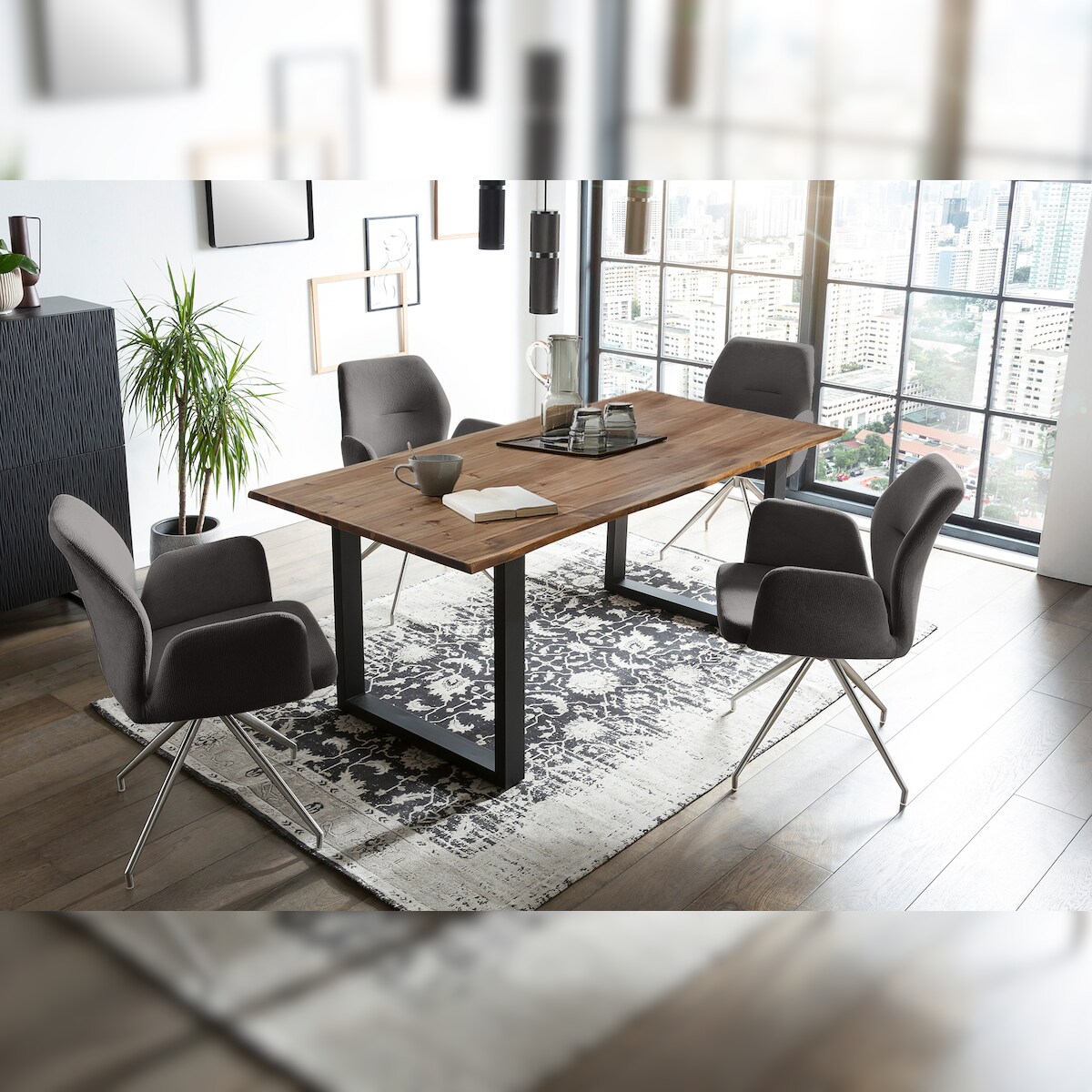 SalesFever Esstischgruppe 5-tlg.|180x90cm|Platte Akazie 26mm nussbaum|Metallgestell schwarz|4 Armlehnstühle 180° drehbar Strukturstoff |d.grau