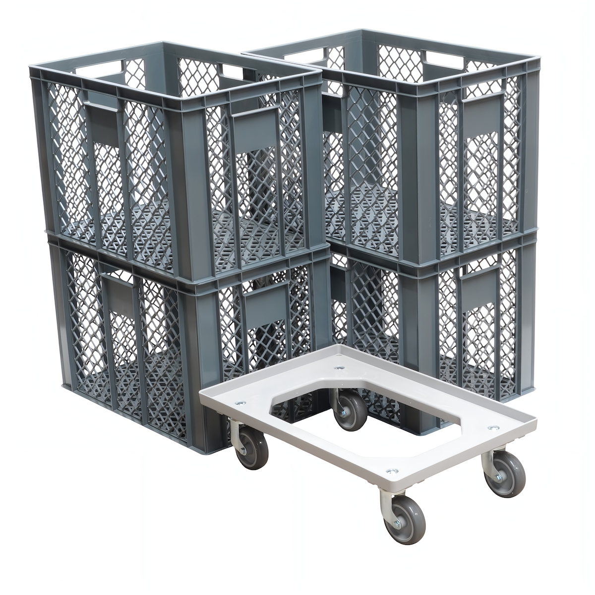 4 Stück Bäckerkisten 600 x 400 x 410 mm + 1 Transportroller in Grau