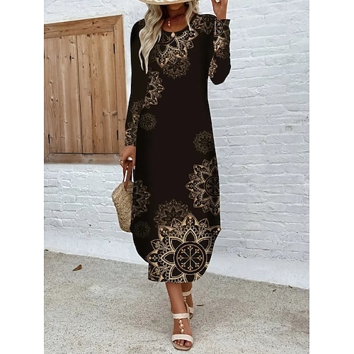 Per donna Abito Midi Tubino Vestito T-Shirt Vacanza Casual Boho Ferie Data Vestibilità regolare Grafico Geometrico Tribale Manica Lunga Girocollo Nero Primavera Autunno Inverno