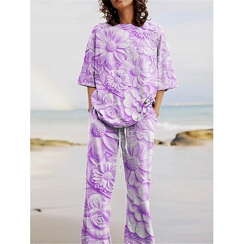 Per donna Attivo Moda Set di Pantaloni Manica 3/4 Girocollo Floreale Stampato Vacanza Quotidiano Ferie Blu Viola Cachi Estate Vestibilità regolare