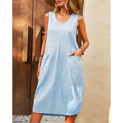 Per donna Abito Midi Vestito Casual Abito in cotone e lino Elegante Moda Moderno Quotidiano Vacanza Uscire Vestibilità comoda Semplice Senza Maniche Collo a U Albicocca Azzurro Estate Primavera