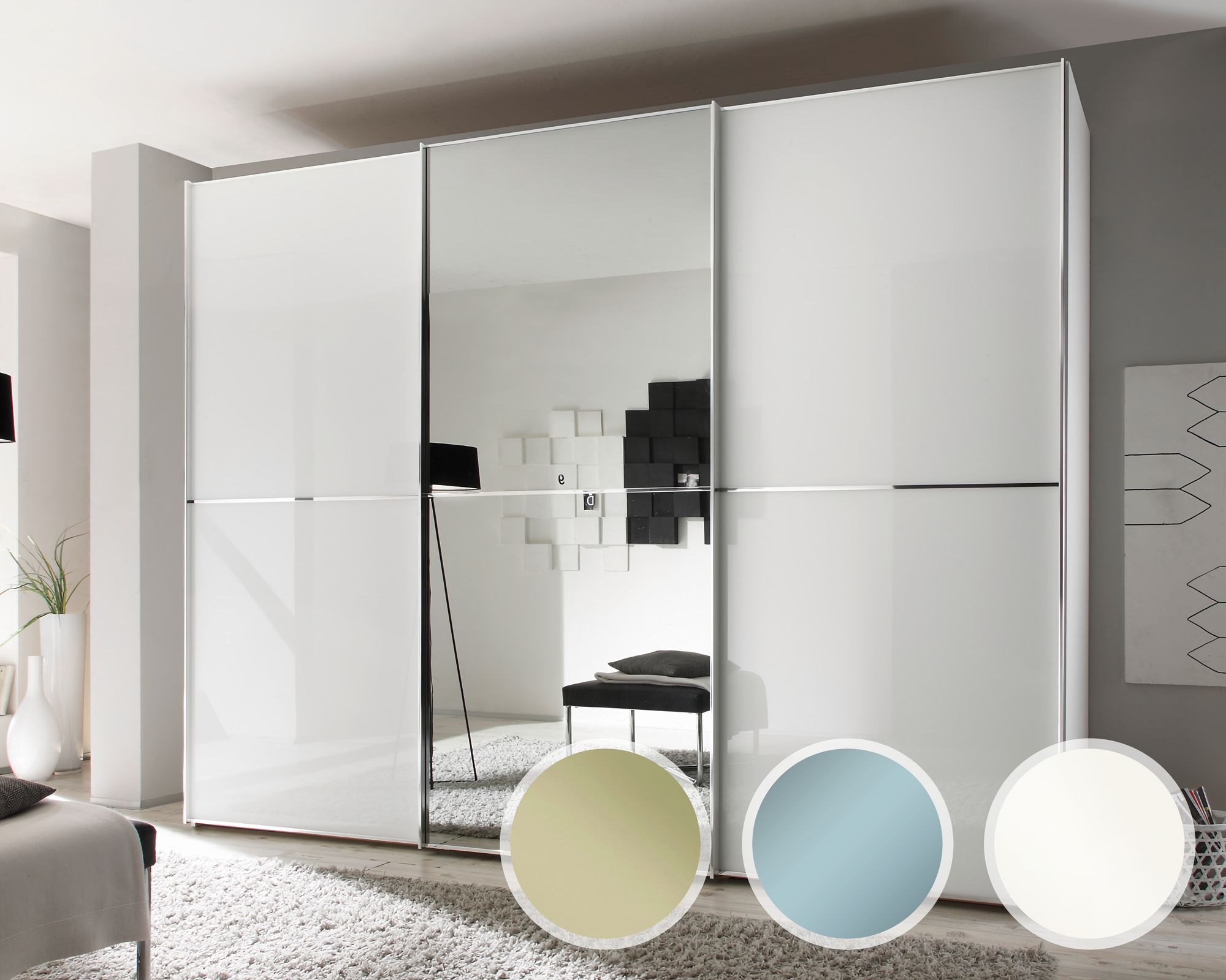 Staud »Sinfonie Plus« Schwebetürenschrank VIII 298 cm / 222 cm / Alpinweissglas / Griffleisten und Zierleisten Chrom