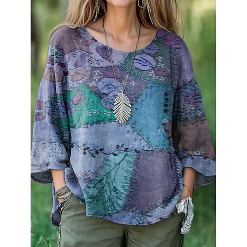 Per donna Blusa Floreale Retrò Vintage Etnico Manica 3/4 Girocollo Top Regolari Quotidiano Ferie Stampato Blu Viola Marrone Estate Primavera Autunno