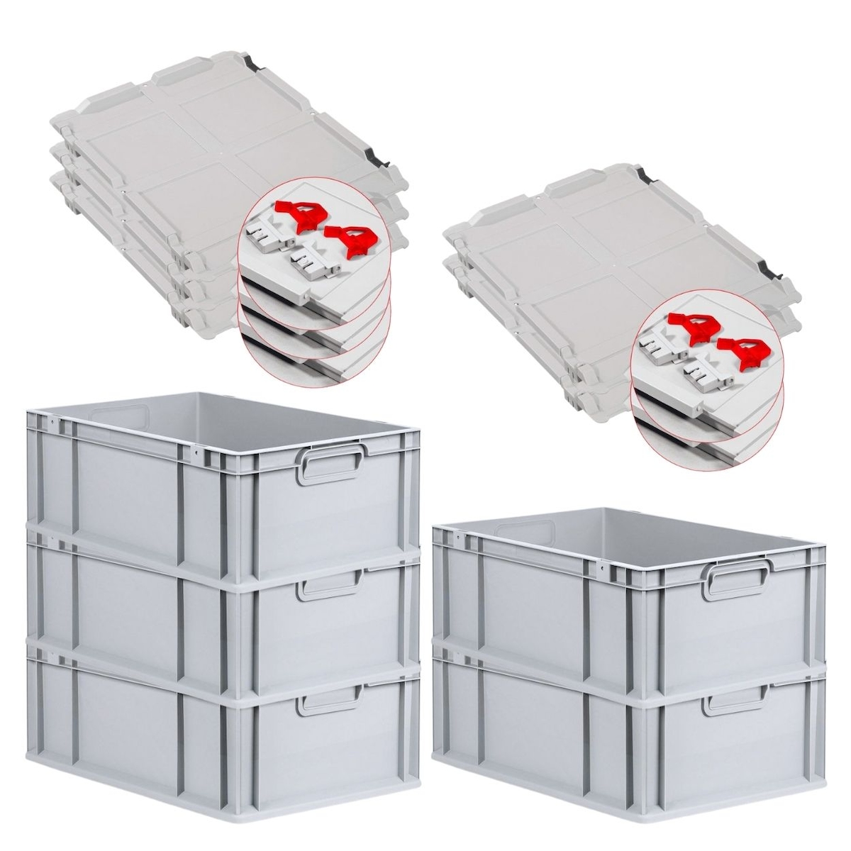 PROREGAL 5x Eurobox NextGen Grip mit Scharnierdeckel & roten Verschlüssen | HxBxT 22x40x60cm | 44 Liter | Griffe geschlossen | Verstärkter Boden