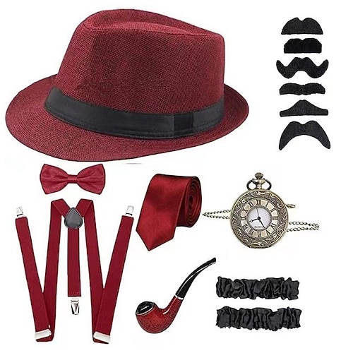 Set Vintage Anni Ruggenti Anni 1920 Set di accessori Fedora Il grande Gatsby Gentiluomo Costume Per uomo 7 PZ Halloween Carnevale Feste Mascherata Adulti Fiocco Cappello Cravatta Tutte le stagioni