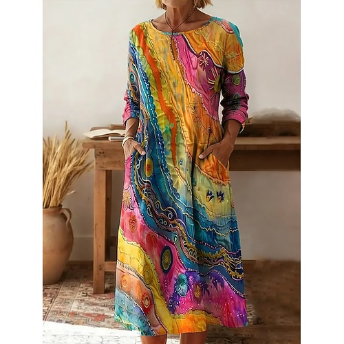 Per donna Abito Midi Tubino Vestito T-Shirt Vacanza Casual Boho Ferie Data Vestibilità regolare Grafico Geometrico Astratto Manica Lunga Girocollo Giallo Rosa Arancione Estate Primavera