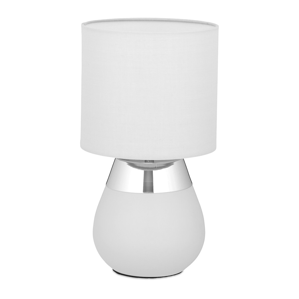 Relaxdays Tischlampe, Metallfuß, Stoffschirm, E14, HxD: 32 x 18 cm, Nachttischlampe mit Kabel, Schlafzimmer, grau/silber