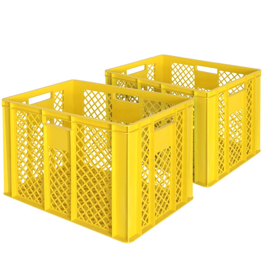 2x Eurobehälter/Bäckerkiste, LxBxH 600 x 400 x 410 mm, lebensmittelecht, Boden und Wände durchbrochen, gelb