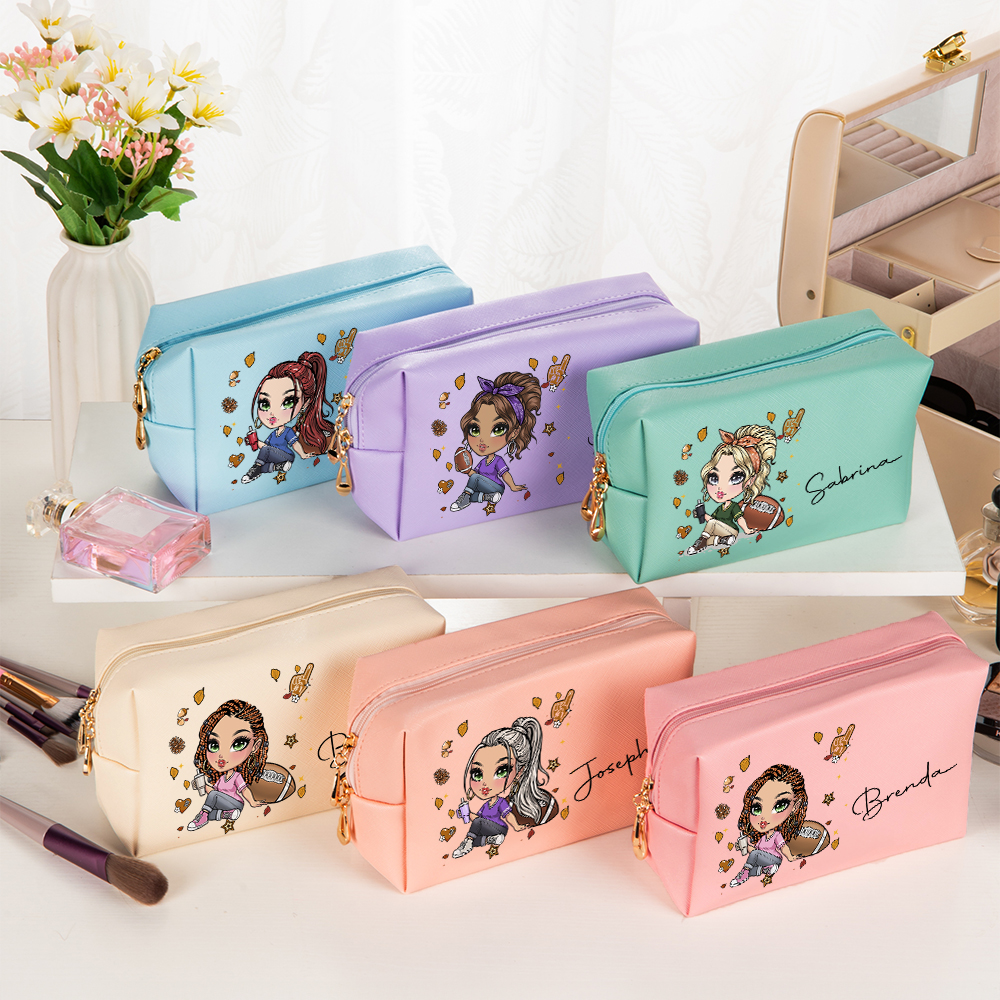 Personalizzato Carino Cartoon Calcio Ragazza Borsa per il trucco in pelle con nome Viaggio portatile Essenziale Regalo di compleanno per le donne