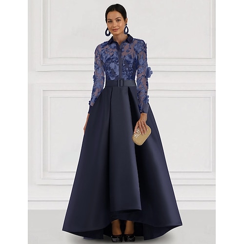 Linea ad A Lunghezza al pavimento Abito da Sera Da principessa Abito formale Elegante Manica Lunga Colletto a Camicia Formale Ferie Tasca Raso Pizzo con Ricamo