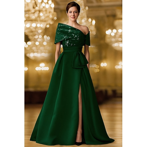 Linea ad A Lunghezza al pavimento Abito da Sera Da principessa Abito formale Elegante Scintillante Setoso Manica Lunga Monospalla Matrimonio Formale Tasca Raso Elasticizzato con Glitter