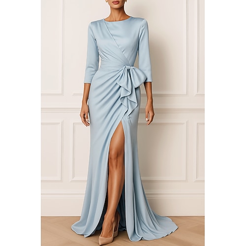 Linea ad A Lunghezza al pavimento Abiti da Ballo Abito da Sera Da principessa Elegante Spacco Alto Manica 3/4 Girocollo Matrimonio Formale Raso con Fiocco/Fiocchi Pieghe Volant