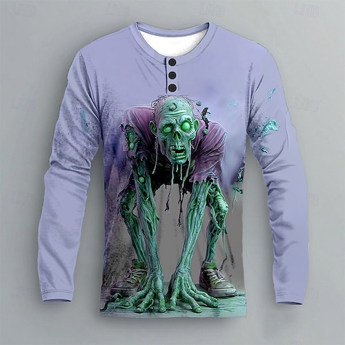Camicia Grafica Zombie da Uomo Henley Manica Lunga Fashion Carina Casual Giornaliero Vacanza Autunno Primavera Autunno Verde Rosso Blu Viola Grigio Henley T-Shirt Henley