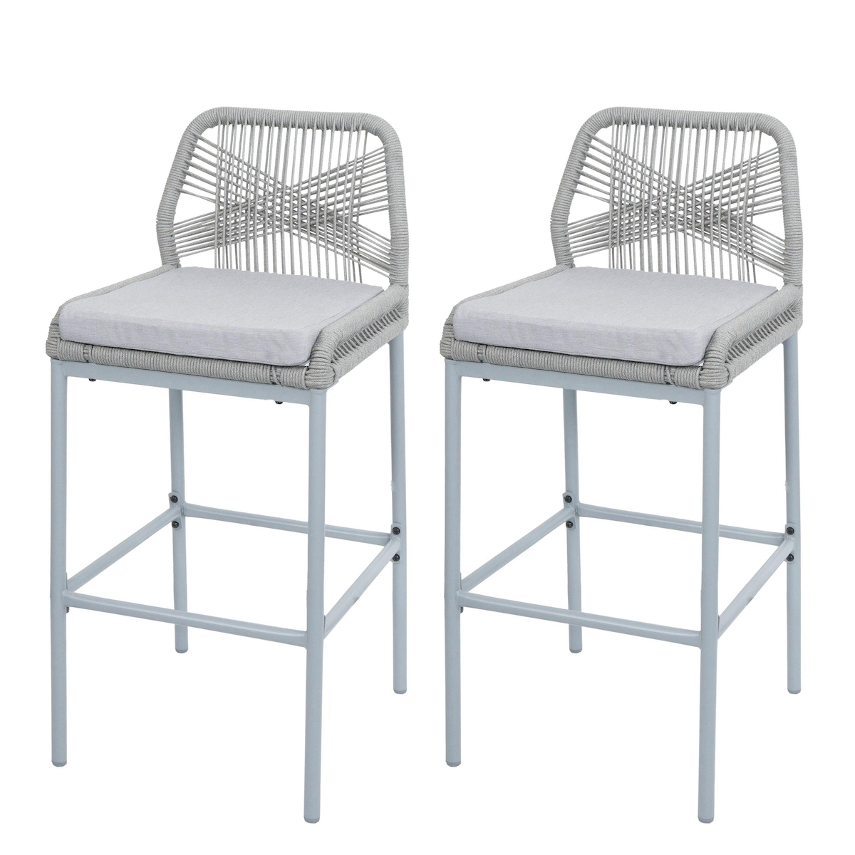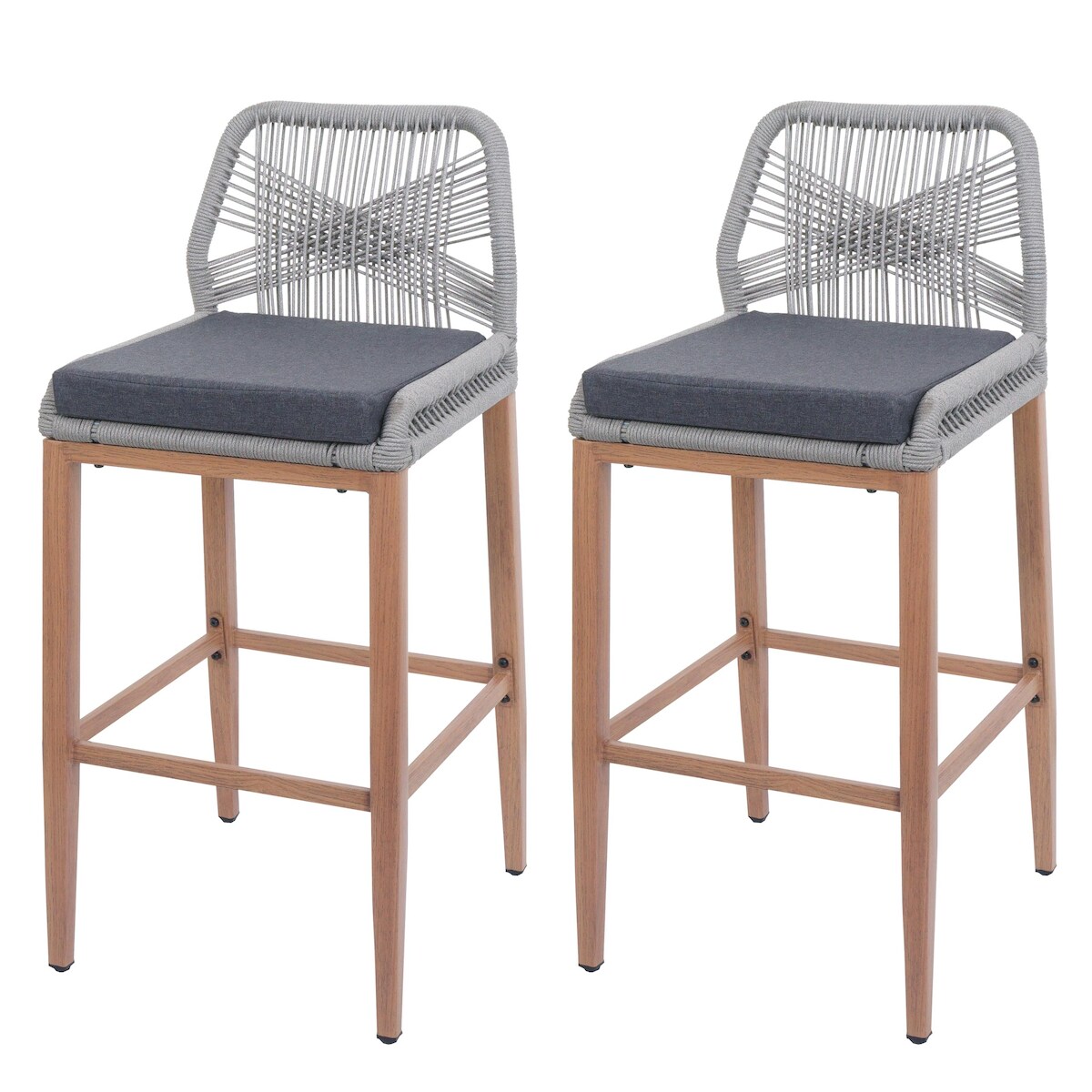 PROREGAL 2er-Set Rope-Barhocker, HxBxT 101x45x50 cm, Sitzhöhe 76cm, Hellgrau, Kissen Dunkelgrau, Outdoor Sitzpolster Seilgeflecht Metall Holz-Optik