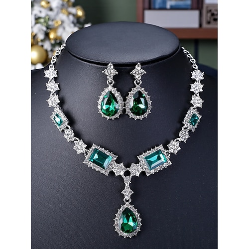set di gioielli da donna in cristallo verde - elegante collana con strass e orecchini pendenti per feste di Natale, banchetti serali o regali per le feste