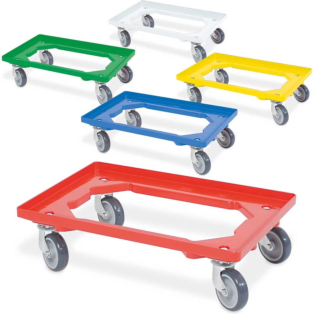 BRB Set, 5x Logistikroller/Kistenroller für Behälter 600 x 400 mm, je 1 Roller in blau, gelb, grün, rot, weiß