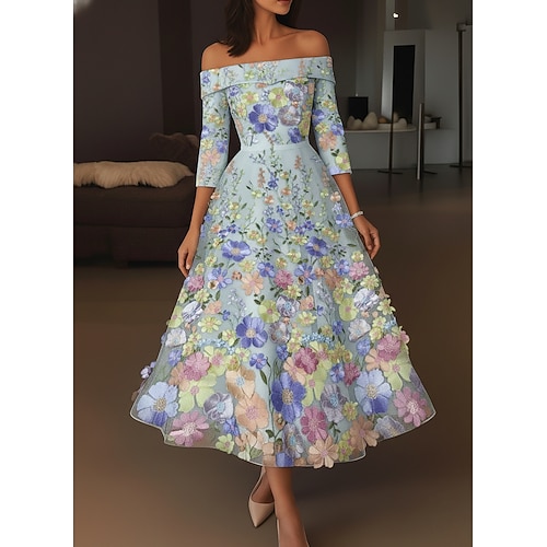 Linea ad A Lunghezza Tè Abiti da Cocktail Elegante Vintage Floreale Mezza Manica Senza Spalle Festa in giardino Matrimonio Tasca Raso Pizzo Shiena scoperta con Ricamo Tasca