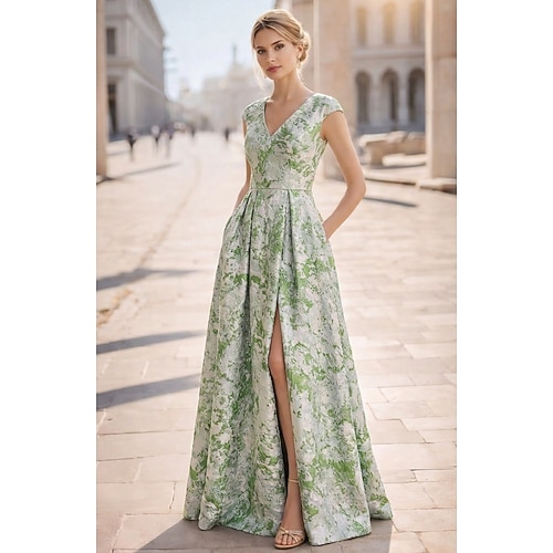 Linea ad A Lunghezza al pavimento Abito da Sera Elegante Vintage Floreale Senza Maniche Scollo a V Festa in giardino Matrimonio Tasca Jacquard con Stampa floreale Spacco Tasca