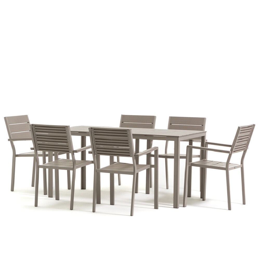 RATTATAN Gartenset mit rechteckigem Tisch 156x78 cm, 6 stapelbaren Sesseln mit Armlehnen, Stahlgestell und Polypropylenplatte – Thomas+Adele – Champagner