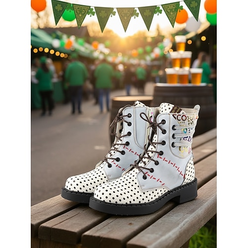 stivaletti da donna con lacci a pois verdi - stivali casual in pelle con stampa decorativa e cerniera laterale, ideali per le feste di San Patrizio, le gite al mercato, gli incontri informali e le commissioni quotidiane