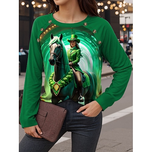 Felpa da donna per il Giorno di San Patrizio con stampa animale street pulsanti casual colletto rotondo a maniche lunghe micro-elastica autunno inverno