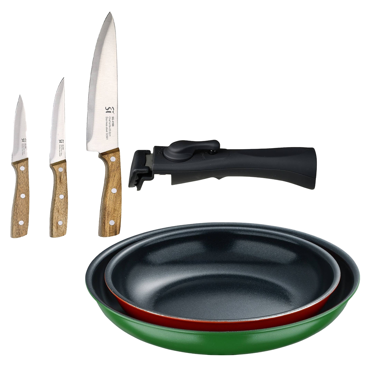 BERGNER - Set aus 2 Pfannen Ø22/26cm gepresstes Aluminium mit abnehmbarem Griff mit Set aus 3 Küchenmessern Edelstahl