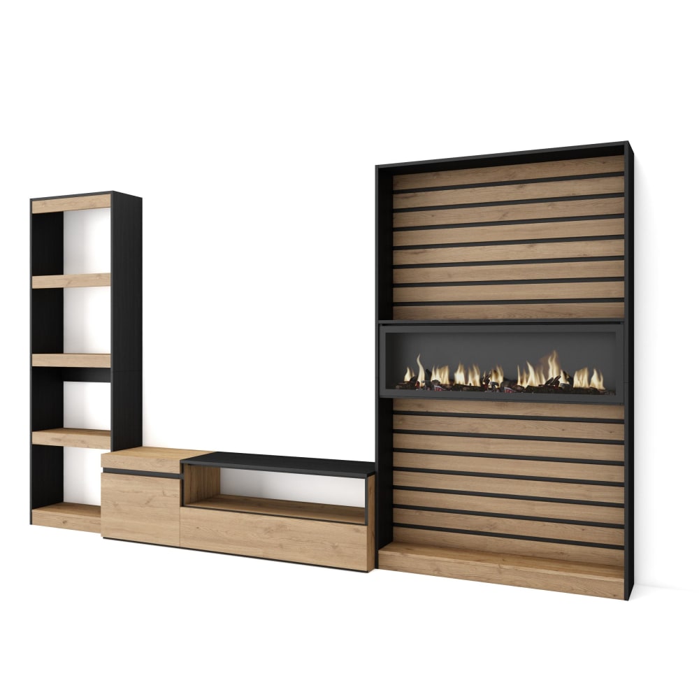 Mobile TV effetto legno rovere nero camino effetto fuoco 320x35x186cm