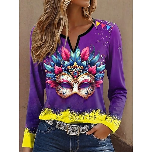 Carnevale Martedì grasso Per donna Maglietta Grafico Geometrico Vintage Elegante Classico Manica Lunga Scollo a V Collo a V Top Regolari Quotidiano Weekend Stampato Giallo Viola Verde Primavera