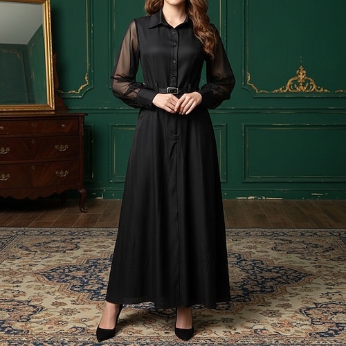 Per donna Abito Midi Abito Camicia Elegante Vintage Moda All'aperto Vacanza Uscire Vestibilità regolare Semplice Manica Lunga Colletto a Camicia Nero Primavera Autunno Inverno