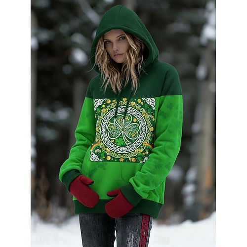 Felpe con cappuccio da donna per il giorno di San Patrizio, stile trifoglio, casual, a maniche lunghe, con cappuccio, casual, da indossare tutti i giorni, con coulisse, stampa, verde, primavera,